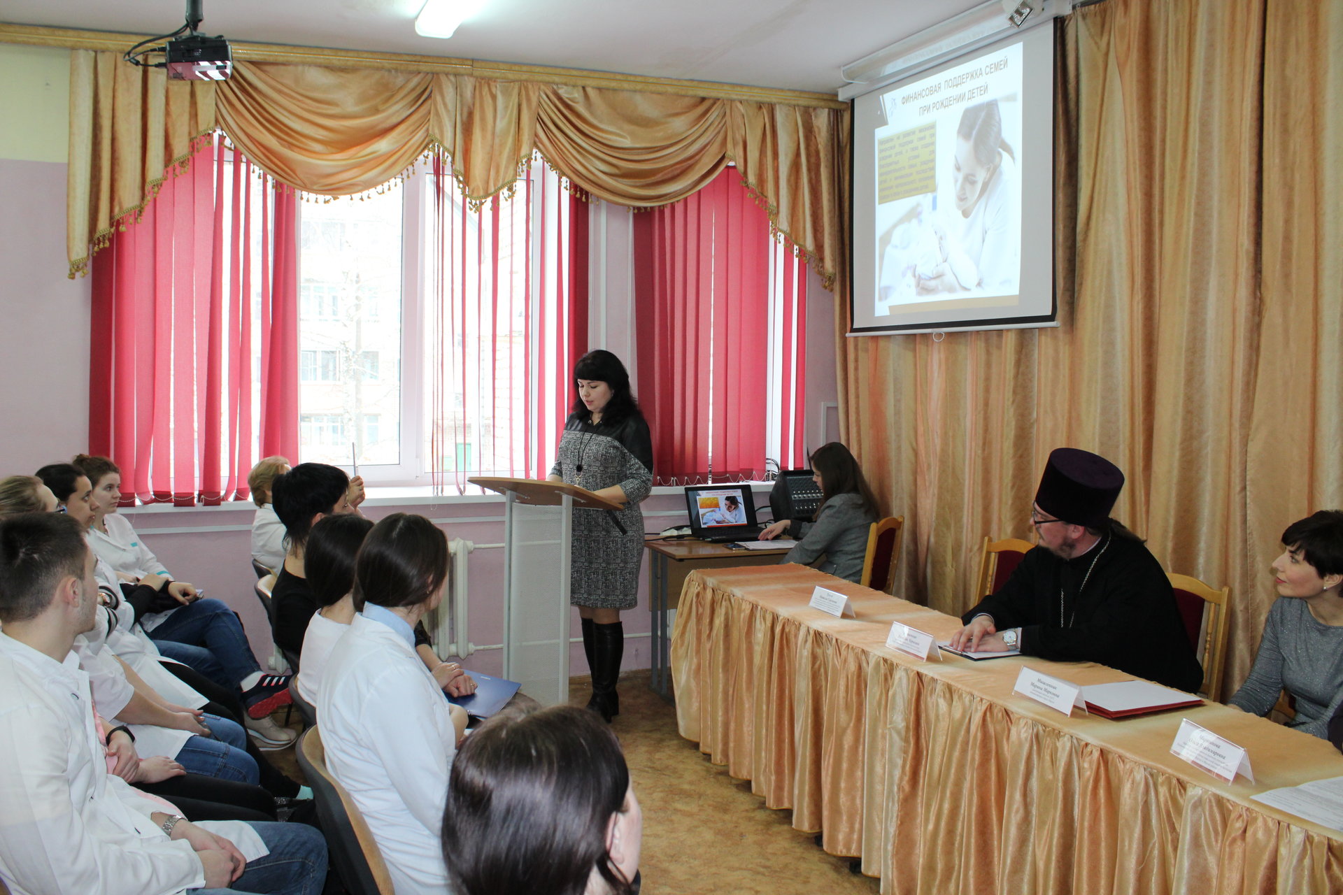Заведующий городским отделом ЗАГС Мышленник Марина Марковна выступила с докладом на тему: «Социальная значимость института брака в настоящее время. Государственная регистрация брака. Значимость семьи в современном обществе». Проинформировала присутствующих о порядке регистрации брака, рождения, установления отцовства, перемены ФИО, ознакомила студентов с образцами свидетельств о рождении и браке.
